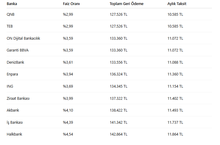 Kasım ayı itibarıyla yapılan güncellemelere göre en düşük faiz oranı %2,99 ile QNB Finansbank ve TEB’te bulunuyor. Bu oranla 12 ay vadeli 100 bin TL ihtiyaç kredisi çeken bir kişinin aylık taksiti 10 bin 585 TL, toplam geri ödemesi ise 127 bin 526 TL seviyesinde gerçekleşiyor.
