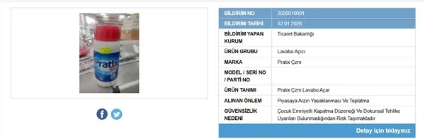 Bakanlık tarafından yürütülen denetim faaliyetleri sonucunda, bir lavabo açıcının insan sağlığı açısından tehlike arz ettiği belirlendi. İncelemeye konu olan Pratix Çzm markasına ait temizlik ürününün, gerekli güvenlik standartlarını karşılamadığı ve güvenli bulunmadığı tespit edildi. Bu tespitin ardından Bakanlık, söz konusu ürünün satışını resmen yasakladı. Satış yasağına ek olarak, riskin ortadan kaldırılması amacıyla ürünün piyasadan toplatılmasına yönelik idari işlemler de başlatıldı.