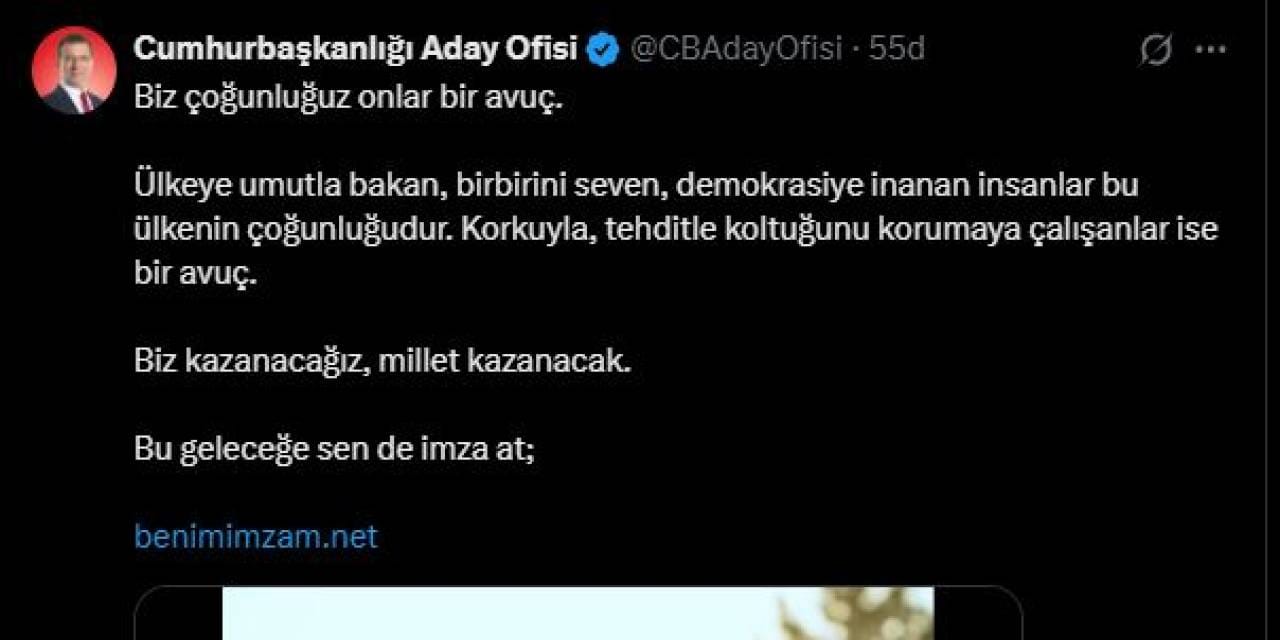 “Biz çoğunluğuz onlar bir avuç. Ülkeye umutla bakan, birbirini seven, demokrasiye inanan insanlar bu ülkenin çoğunluğudur. Korkuyla, tehditle koltuğunu korumaya çalışanlar ise bir avuç. Biz kazanacağız, millet kazanacak. Bu geleceğe sen de imza at”