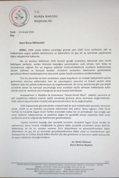 Bursa Barosu, 2026 yılıyla birlikte yürürlüğe girecek yeni CMK ücret tarifesinin adil ve hakkaniyete uygun şekilde belirlenmesi ve ödemelerin en geç bir ay içerisinde yapılmasına ilişkin talepleri içeren mektubu Bursa milletvekillerine gönderdi.