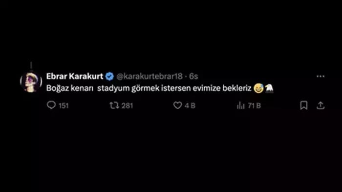 Karakurt verdiği cevapta “Boğaz kenarı stadyum görmek istersen evimize bekleriz” sözlerini sarf etti.