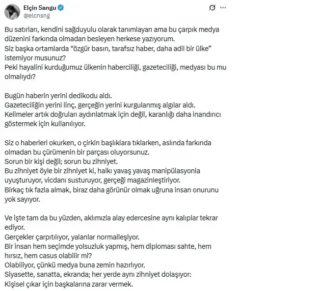 Ünlü oyuncu Elçin Sangu, sosyal medya hesabından dikkat çeken bir paylaşım yaptı. Ülkede yapılan gazeteciliğe ve medyaya eleştirilerde bulunan ünlü oyuncu, paylaşımında, 23 Mart’tan beri tutuklu olan Cumhurbaşkanı adayı ve İBB Başkanı Ekrem İmamoğlu …
