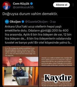 Bursa Emekli ve Emekçiler Derneği olarak yapılan açıklamada, son dönemde ülke genelinde emeklilerin barınma konusunda yaşadığı büyük kriz gözler önüne serildi. Sedat Hastürk, Türkiye’nin dört bir yanındaki emeklilerin yaşam şartlarının her geçen gün daha da kötüleştiğini ve devletin bu konuda hiçbir çözüm üretmediğini söyledi. “Emekliler, sıcak bir yuva aramak yerine, banyosu, tuvaleti olmayan, yalnızca piknik tüpüyle ısınan izbe odalarda yaşamaya mahkûm edilmiştir. Bu, bir sosyal adaletsizlik değil, doğrudan bir insanlık dramıdır!” diyerek durumu ağır bir şekilde eleştirdi.