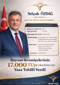 Yeni Yol Muğla Milletvekili Selçuk Özdağ, emeklilere ödenen bayram ikramiyelerinin 17 bin TL’ye çıkarılması amacıyla Türkiye Büyük Millet Meclisi’ne (TBMM) kanun teklifi sundu. 28. Dönem Muğla Milletvekili olan Özdağ’ın imzasını taşıyan teklif, Sosyal Sigortalar ve Genel Sağlık Sigortası Kanunu’nda değişiklik yapılmasını öngörüyor.