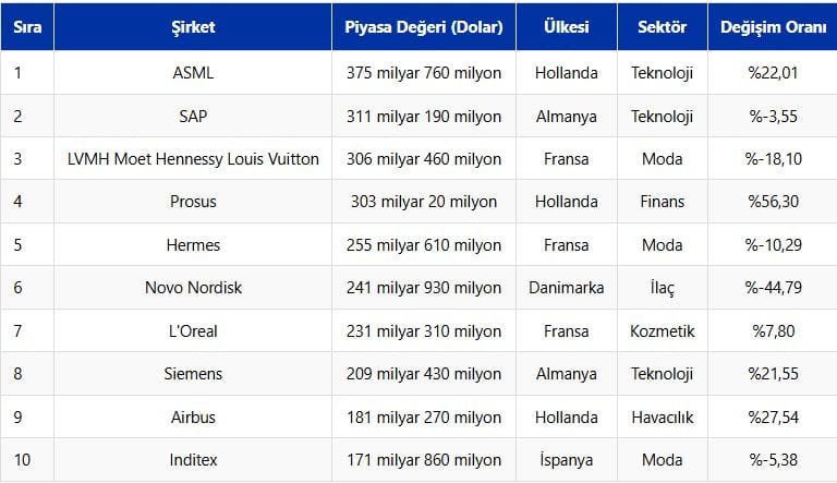 Avrupa’nın en değerli 10 şirketinin piyasa değerleri, sektörleri ve hisse fiyatlarının yılbaşından bu yana yüzdesel farkları şöyle: