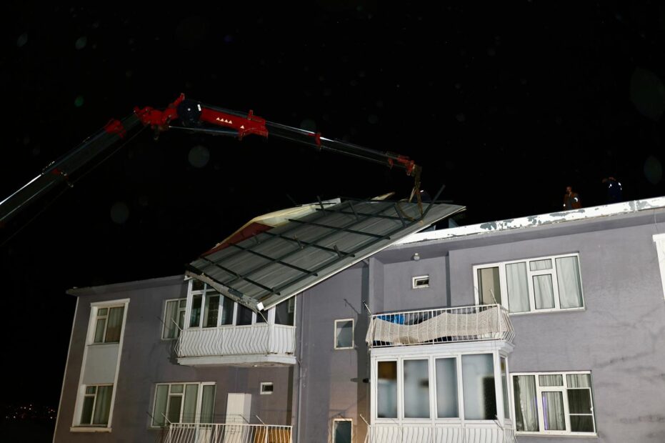 Cumhuriyet Mahallesi Doğar Sitesi’nde şiddetli rüzgâr nedeniyle bir binanın çatısı uçarak hasar gördü. İhbarın ardından Gemlik Belediyesi ekipleri hızla olay yerine sevk edildi. Yapılan incelemelerin ardından güvenliği tehdit eden çatı için hemen müdahale başlatıldı.