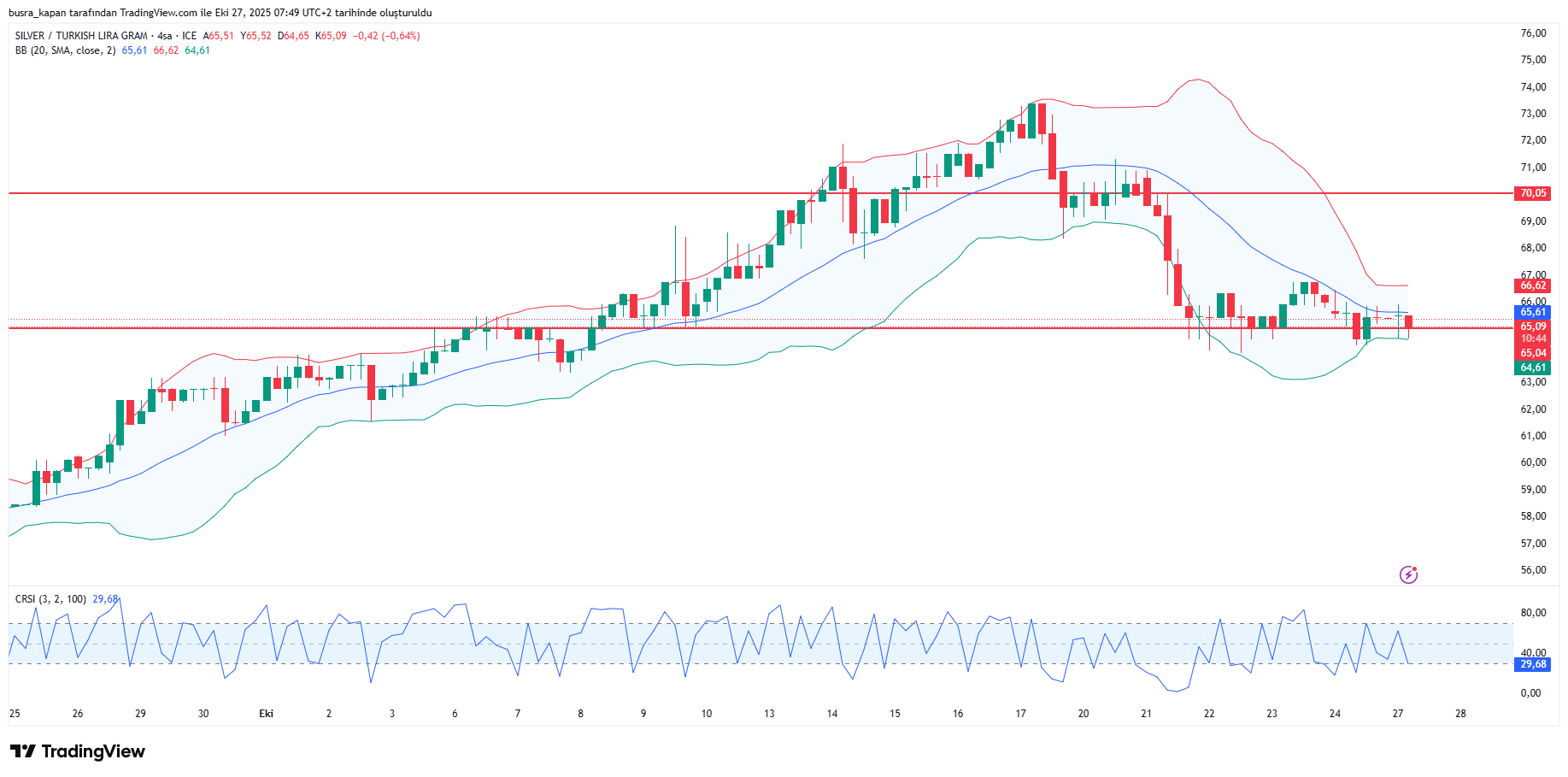 Gram gümüş güne 65,43 liradan başladı. Gün içinde en düşük 64,56 lira en yüksek de 65,76 lira seviyesi görüldü. Sabah seansında 08.47’de 65,47 seviyesinde bulunuyor.