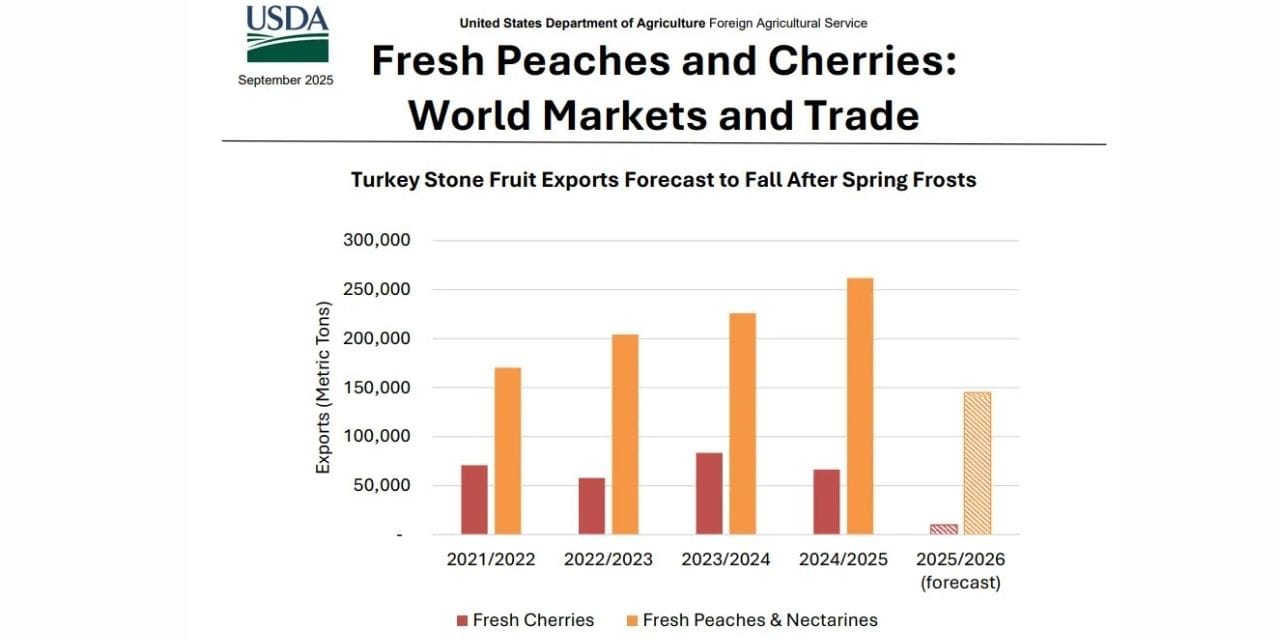 USDA’nın sert çekirdekli meyve raporunda, Türkiye’nin şeftali ve nektarin ihracatının yüzde 45 düşerek 145 bin tona, kiraz ihracatının ise yüzde 85 gerileyerek 10 bin tona inmesinin öngörüldüğü belirtildi. Bu gerilemeyle Türkiye, geçtiğimiz sezon dünyanın en büyük şeftali–nektarin ihracatçısı konumundayken ikinci sıraya, kirazda ise üçüncü basamaktan sekizinci sıraya gerileyecek.