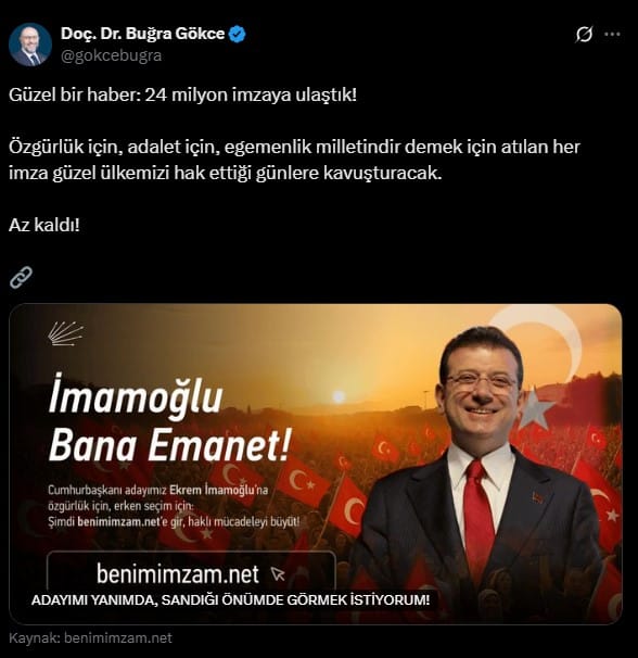 “Güzel bir haber: 24 milyon imzaya ulaştık! Özgürlük için, adalet için, egemenlik milletindir demek için atılan her imza güzel ülkemizi hak ettiği günlere kavuşturacak. Az kaldı!”