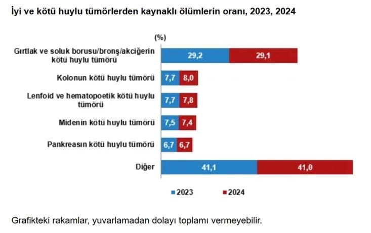İyi ve kötü huylu tümörlerden kaynaklı ölümler illere göre incelendiğinde, 2024 yılında bu hastalıklara bağlı ölüm oranının en yüksek olduğu ilin %21,7 ile Ağrı olduğu görüldü. Bu ili %21,4 ile Bingöl, %20,7 ile Ankara, %20,3 ile Van izledi.