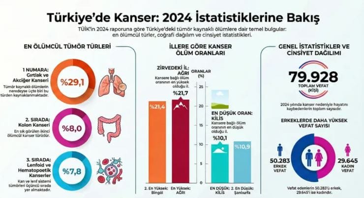 2024 yılında kanser nedeniyle vefat eden toplam kişi sayısı 79 bin 928 olurken bu sayının 50 bin 283’ü erkek, 29 bin 645’i kadın oldu.