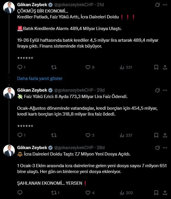CHP Genel Başkan Yardımcısı Gökan Zeybek sosyal medya hesabından yaptığı açıklamada, “Çökmüş bir ekonomi. Krediler Patladı, Faiz Yükü Arttı, İcra Daireleri Doldu Batık Kredilerde Alarm: 489,4 Milyar Liraya Ulaştı. 19–26 Eylül haftasında batık krediler 4,5 milyar lira artarak 489,4 milyar liraya çıktı. Finans sisteminde risk büyüyor” ifadelerini kullandı.