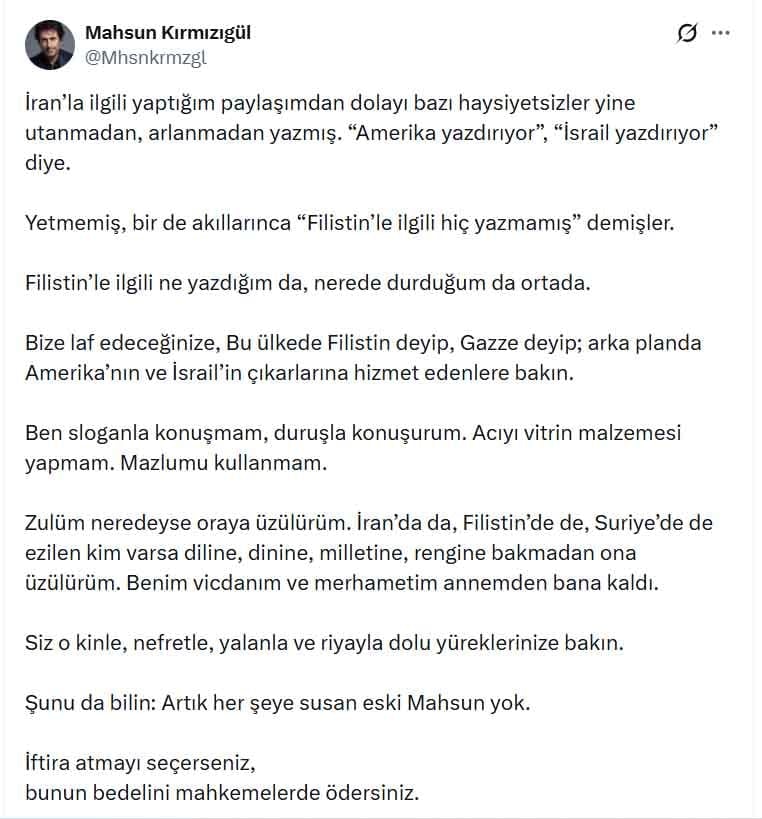 “İran’la ilgili yaptığım paylaşımdan dolayı bazı haysiyetsizler yine utanmadan, arlanmadan yazmış. ‘Amerika yazdırıyor’, ‘İsrail yazdırıyor’ diye. Yetmemiş, bir de akıllarınca ‘Filistin’le ilgili hiç yazmamış’ demişler. Filistin’le ilgili ne yazdığım da, nerede durduğum da ortada. Bize laf edeceğinize, bu ülkede Filistin, Gazze deyip arka planda Amerika’nın ve İsrail’in çıkarlarına hizmet edenlere bakın. Ben sloganla konuşmam, duruşla konuşurum. Acıyı vitrin malzemesi yapmam. Mazlumu kullanmam. Zulüm neredeyse oraya üzülürüm. İran’da da, Filistin’de de, Suriye’de de ezilen kim varsa diline, dinine, milletine, rengine bakmadan ona üzülürüm. Benim vicdanım ve merhametim annemden bana kaldı. Siz o kinle, nefretle, yalanla ve riyayla dolu yüreklerinize bakın. Şunu da bilin: Artık her şeye susan eski Mahsun yok. İftira atmayı seçerseniz, bunun bedelini mahkemelerde ödersiniz.”