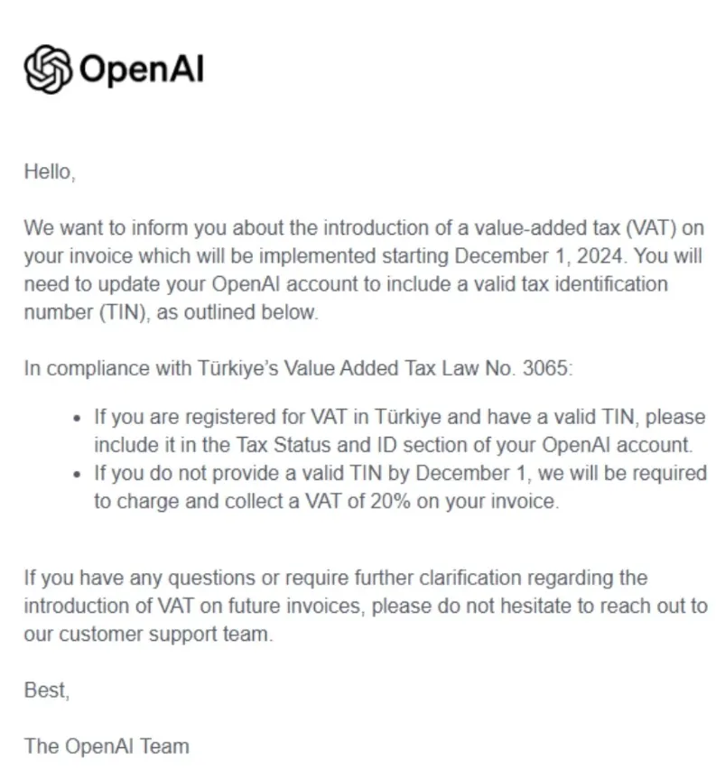 “Faturalarınıza 1 Aralık 2024 tarihinden itibaren uygulanacak olan katma değer vergisi (KDV) hakkında sizi bilgilendirmek istiyoruz. OpenAI hesabınızı aşağıda belirtildiği gibi geçerli bir vergi kimlik numarası (VKN) içerecek şekilde güncellemeniz gerekecektir.”