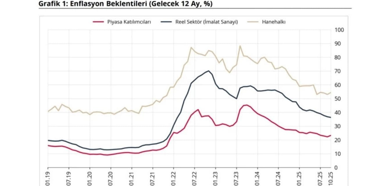 Türkiye Cumhuriyet Merkez Bankası (TCMB), Ekim 2025 Sektörel Enflasyon Beklentileri verilere göre, ekim ayında yıllık enflasyon beklentileri piyasa katılımcıları ve hane halkı için artarken, reel sektör tarafında düşüş kaydedildi.