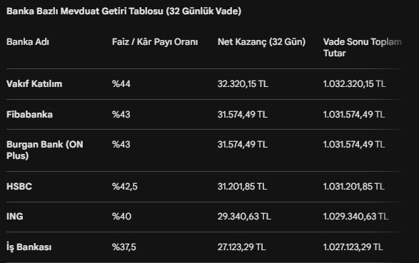 Yatırımcıların en çok merak ettiği 1 milyon TL’lik anaparanın getirisi, seçilen vade ve faiz oranına göre farklılık gösteriyor. 32 günlük (aylık) vadede en yüksek kazanç 32 bin 320 TL seviyesini görürken, vade süresi 92 güne (3 aya) çıkarıldığında toplam net kazanç 93 bin 488 TL olarak hesaplanıyor.