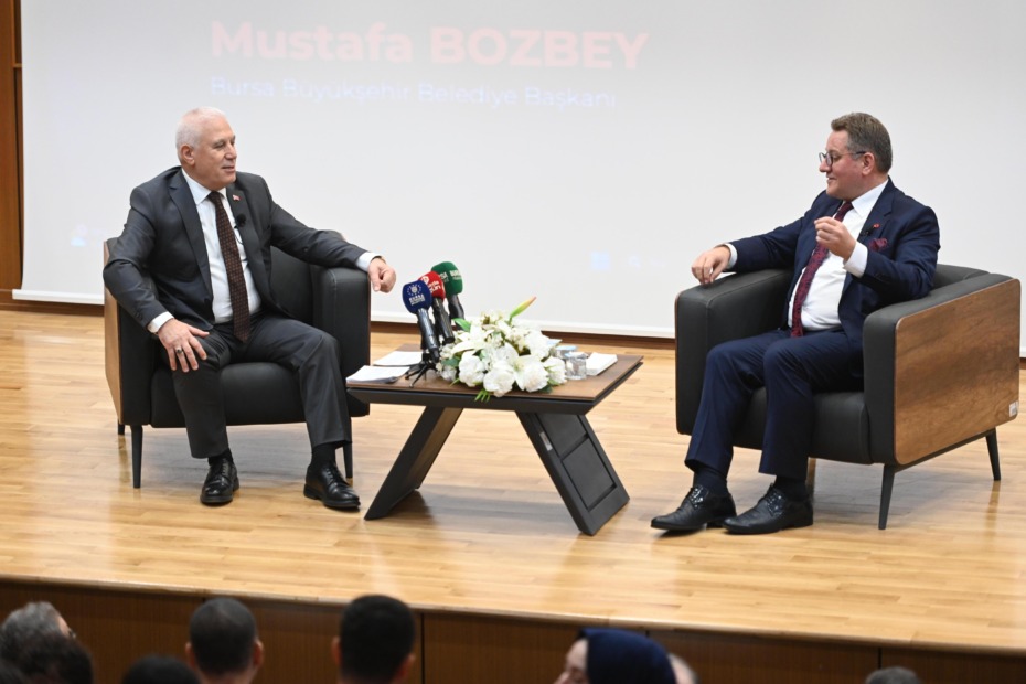 Bursa’yı yeniden Yeşil Bursa yapmak ve herkesin huzur içerisinde yaşamasını sağlamak adına çalışmalar yürüttüklerini belirten ve öğrencilerden gelen soruları cevaplayan Başkan Bozbey, Bursa için gelecek hedeflerini paylaştı. Her fikir ve eleştiriye açık olduklarını belirten Başkan Bozbey, “Gençlerin fikirleri bizler için çok önemli. Her eleştiriyi farklı bir bakış açısı ve önemli kabul ediyoruz. Bursa’yı yeniden Yeşil Bursa yapmak için her kesimin katılım sağlayacağı bir plan ortaya çıkacak. Bu Bursa’nın Kent Anayasası olacak. Bursa’nın çok önemli jeotermal kaynakları var. Sağlık turizminin oldukça önemli olduğu bu dönemde Bursa’yı dünya genelinde ön plana çıkarmak istiyoruz. Bursa, deprem bölgesi içinde. Önce mevcut yapılarımızı güçlendirmemiz gerekiyor. Kentsel dönüşümden anladığımız yıkıp yerine yenisini yapmak değil. Her türlü yaşam alanının olduğu insanların deprem korkusu olmadan, ihtiyaçlarına ulaşabildiği alanlar ortaya çıkarmak istiyoruz. Şu an kent merkezinde 7 mahallede kentsel dönüşüm çalışmamız devam ediyor. Yine 14 mahallede daha saha çalışması yapıyoruz. Mevcut ulaşım master planında tadilat yapacağız. Öncelikli olarak Çalı’dan Demirtaş’a kadar olan bir raylı sistemi bitirmek istiyoruz. Yaklaşık 100 kilometrelik bir raylı sistem hattıyla birlikte Bursa’nın ulaşım sorunun yüzde 80’inin çözüleceğini düşünüyorum” dedi.