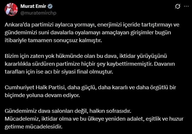 Eski Hatay Büyükşehir Belediye Başkanı Lütfü Savaş ve bazı delegelerin, 4-5 Kasım 2023’te yapılan 38. Olağan ve 6 Nisan 2025’teki 21. Olağanüstü kurultayına ilişkin açılan iptal davası reddedildi. Ankara 42. Asliye Hukuk Mahkemesi, iptal istemiyle …