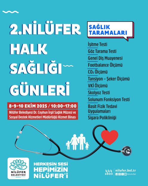 Nilüfer Belediyesi, 8-10 Ekim tarihlerinde 2. Nilüfer Halk Sağlığı Günleri’ni düzenliyor. Üç gün boyunca ücretsiz sağlık taramaları, atölyeler ve farkındalık stantlarıyla dolu program, vatandaşları sağlık için harekete geçmeye çağırıyor.