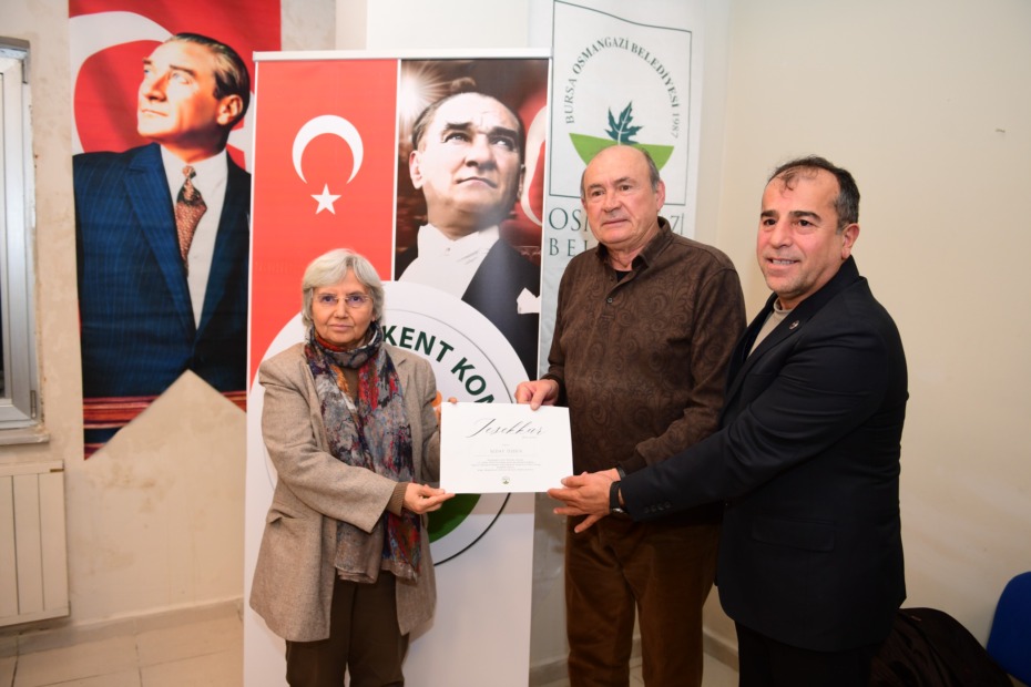 Panelin sonunda Osmangazi Kent Konseyi Başkanı Sevim Sakallı, Osmangazi Belediyesi Meclis Üyesi Bülent Akça ve Osmangazi Kent Konseyi Genel Sekreteri Sosyolog Mutlu Çınar, moderatör Mehmet Ali Ekmekçi ile konuşmacılar Sedat Özden, Adnan Örnek, Yaren Evinç ve Ceren Evinç’e teşekkür belgesi takdim etti. Konuşmacılar, bu değerli etkinliğe desteklerinden ötürü Osmangazi Belediyesi’ne ve Osmangazi Belediye Başkanı Erkan Aydın’a teşekkürlerini sundu.