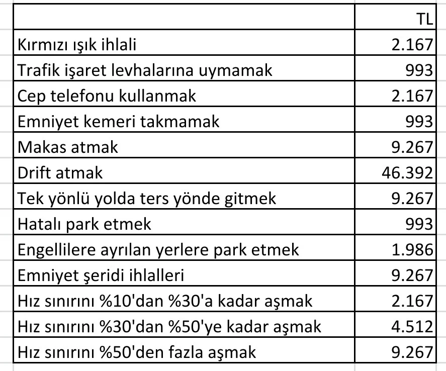 Trafik kurallarını ihlal eden sürücüler için ceza oranları ise oldukça yüksek olacak. Örneğin, makas atan sürücülerin cezası 9.267 TL’ye, drift yapanların cezası ise 46.392 TL’ye çıkacak.