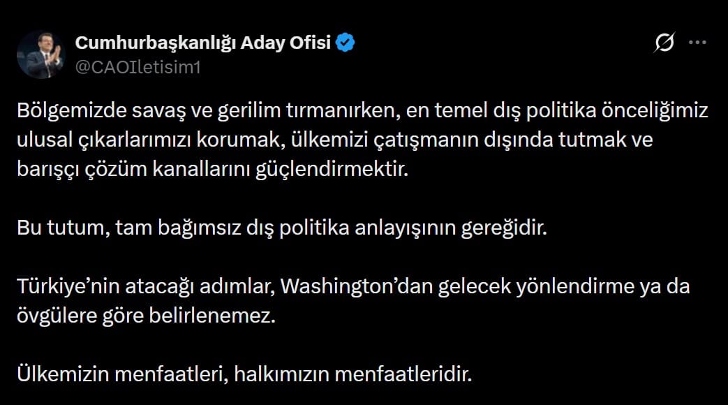 Tutuklu Cumhurbaşkanı adayı ve İBB Başkanı Ekrem İmamoğlu, bölgede tırmanan savaşın gölgesinde, sosyal medya hesabı üzerinden dış politikaya ilişkin bir açıklama yayımladı. Türkiye’nin temel önceliğinin ulusal çıkarlar ve barışçı çözüm olması gerektiğini savunan İmamoğlu, Ankara’nın Washington ile olan ilişkisindeki tutumuna yönelik şu ifadeleri kullandı: