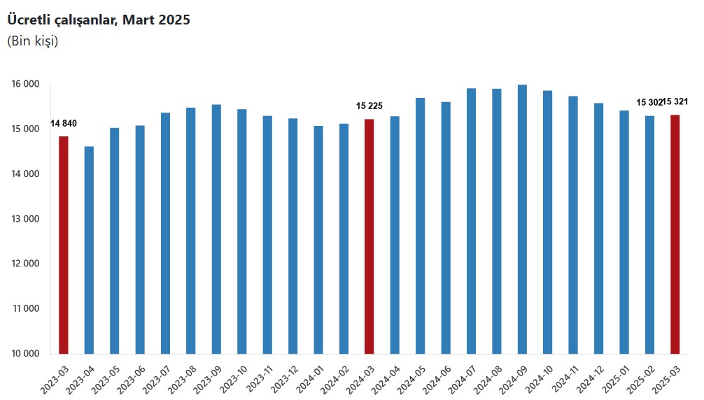 2025 Mart ayında, toplam ücretli çalışan sayısı geçen yılın aynı ayına kıyasla %1,9 oranında artış göstererek 15 milyon 320 bin 987 kişiye ulaşmıştır. Ancak, geçen aya göre incelemede ise %0,2’lik bir azalma yaşanmış, böylece toplam ücretli çalışan sayısı 15 milyon 224 bin 973 seviyesinden 15 milyon 320 bine yükselmiştir. Bu durum, yıl boyunca sektörel bazda yaşanan değişimlere ve ekonomik hareketlere işaret etmektedir.