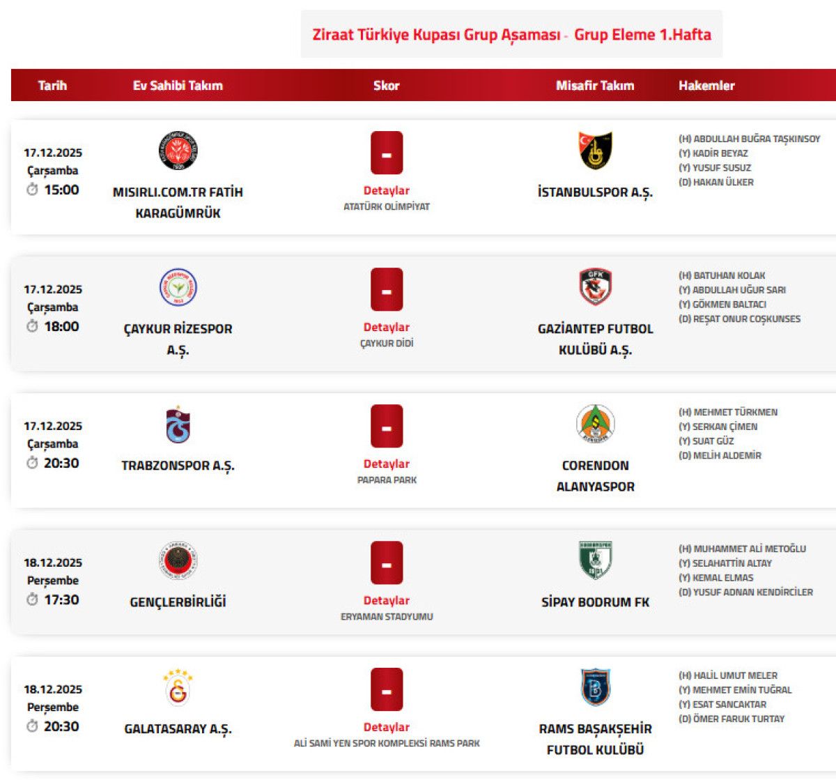 Türkiye Kupası grup aşamasında yarın ve 18 Aralık Perşembe günü oynanacak maçların hakemleri açıklandı.