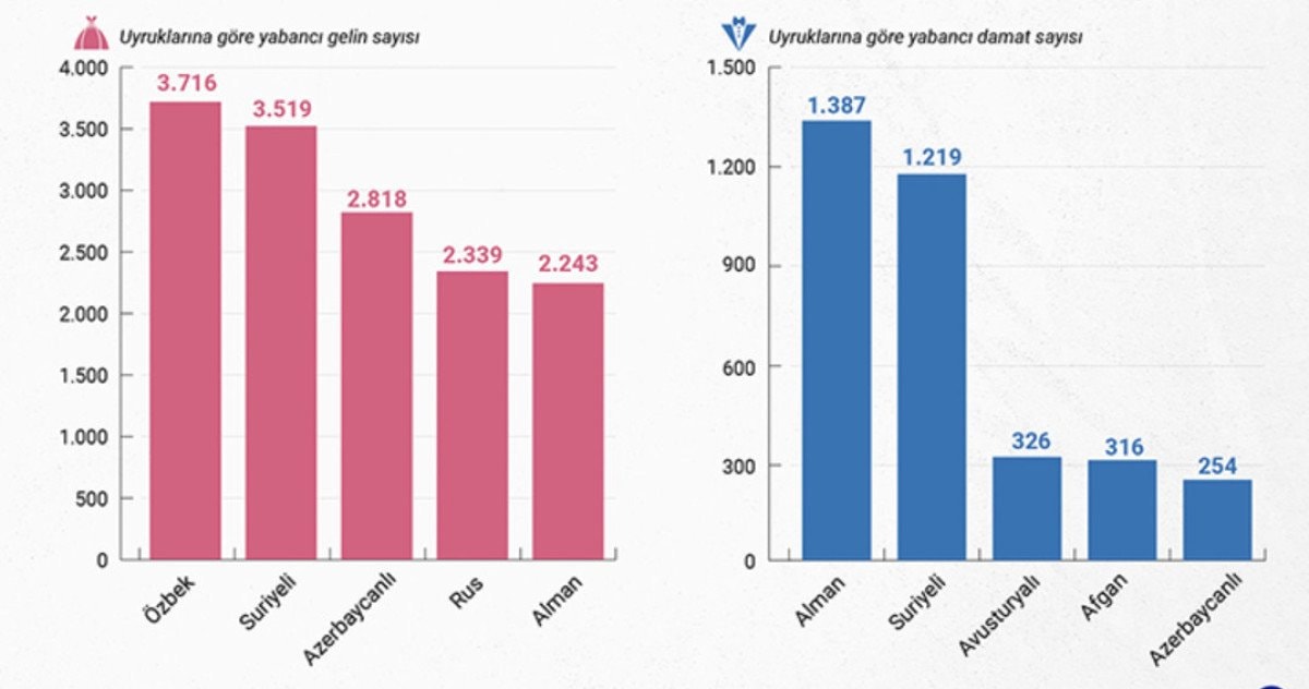 Yabancı gelinler uyruklarına göre incelendiğinde, yabancı gelinler içinde yüzde 12,1 ile Suriyeli ve Özbek gelinler birinci sırada yer aldı. Bu gelinleri yüzde 8,3 ile Faslı gelinler ve yüzde 7,5 ile Azerbaycanlı gelinler izledi.