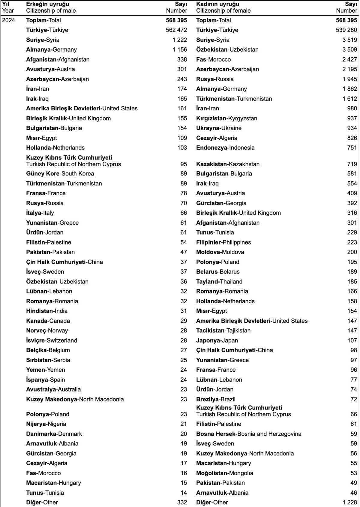 Toplam evlenmeler içinde yabancı kişiler ile evlenmeler incelendiğinde, yabancı damatların sayısı 2024 yılında 5 bin 923 olup, toplam damatların yüzde 1,0’ını oluştururken yabancı gelinlerin sayısı 29 bin 115 olup toplam gelinlerin yüzde 5,1’ini oluşturdu.
