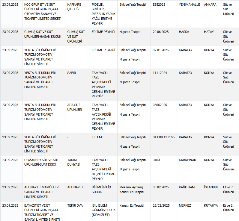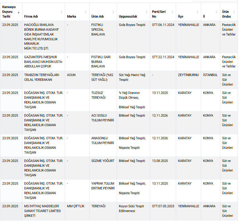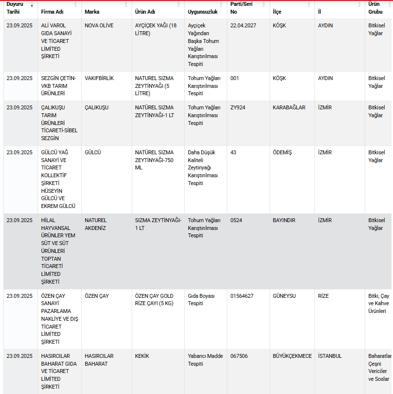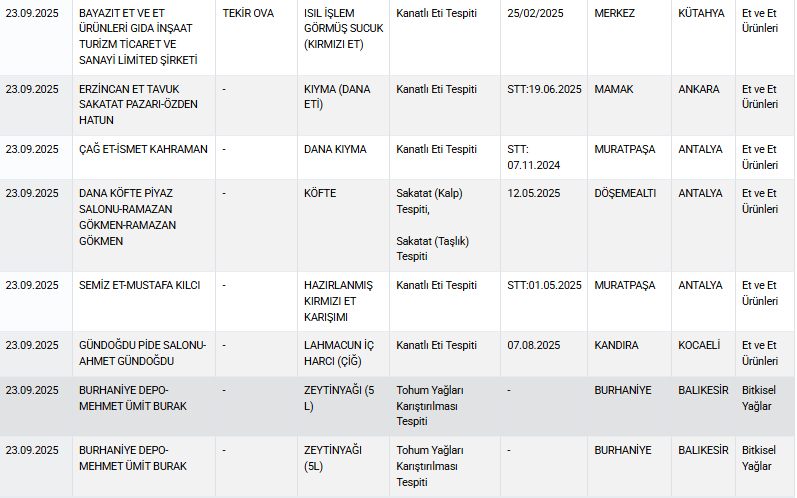 Ticaret Bakanlığı’nın açıkladığı 23 Eylül 2025 listesi, gıda güvenliğinde yaşanan sorunları bir kez daha gözler önüne serdi.