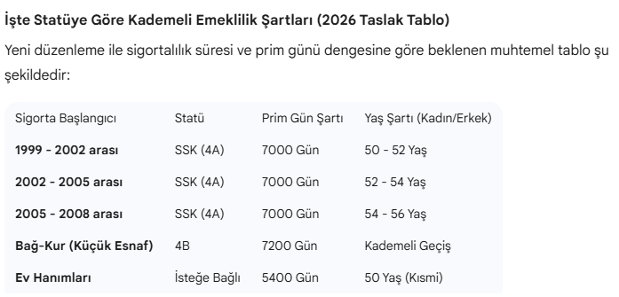 -SSK’lılar (4A): 7000 prim gününü tamamlayanlar için kademeli geçiş. Kısmi emeklilikte ise 15 yıl sigortalılık ve 3600 gün şartı ile yaş haddinde indirim bekleniyor.